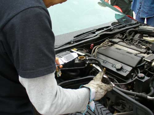 最初はキャップの不良かと思いましたが、どうも違う。サーモから先のホースが冷たい。つまりサーモの弁が開いてないということで、サーモを取っ払いました。作業しているのは関東支部長のはっしーさんです。