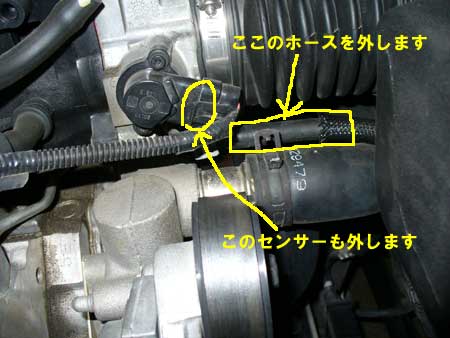 スロットルボディを外すところの写真はありませんが、取り付けは3本のネジで止めてあるだけなんで簡単にできます。注意点は下側のネジを外す時にエンジンルームに落っことさないようにすることです。探すのに大変です。。