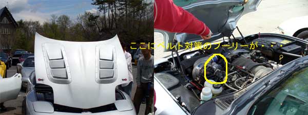 毎度おなじみのCCJ関東支部長のはっしー号です。久しぶりに見たらまた変化してましたね。。。ボンネットにはでかい空気の通り抜け穴が・・スッチャーは前からついていましたが、ベルト対策のワンオフのプーラーが付いていました。写真は有りませんが、ホイールもTE37に、タイヤはSタイヤが付いていましたね。。。