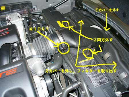手前の金具を外してフィルターを外します。